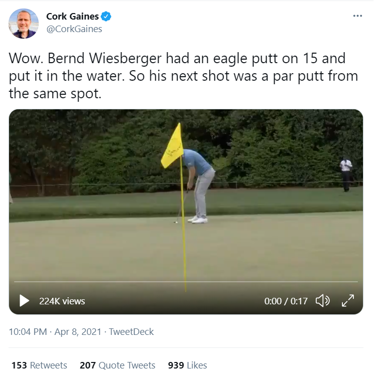 There were so many other stories out there as usual - Ancer's 2 shot penalty (basically a warning to Fatty Feed), The Bulk's tied score with Woosie and trailing Langer on this tricky par 67 layout, the curse of the world # 1 tag at Augusta, Rory's inevitable collapse on day 1 of a major, the list goes on. Catch some of these highlights now: